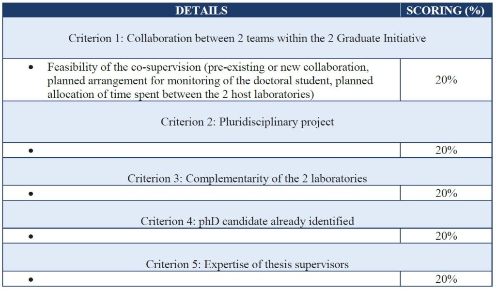 The criteria for the selection for the PhD project (phase 1) are described in the table below: