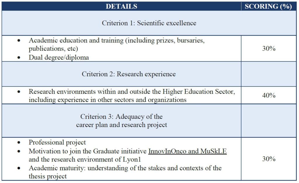 The Lyon1 University is very proud to announce scholarships in support of excellent students who wish to complete their PhD in France, in an interdisciplinary doctoral program dedicated to link Oncology and the musculoskeletal system. Scholarships are supported by the Graduate initiative InnovInOnco and MuSkLE within the Graduate + framework.
